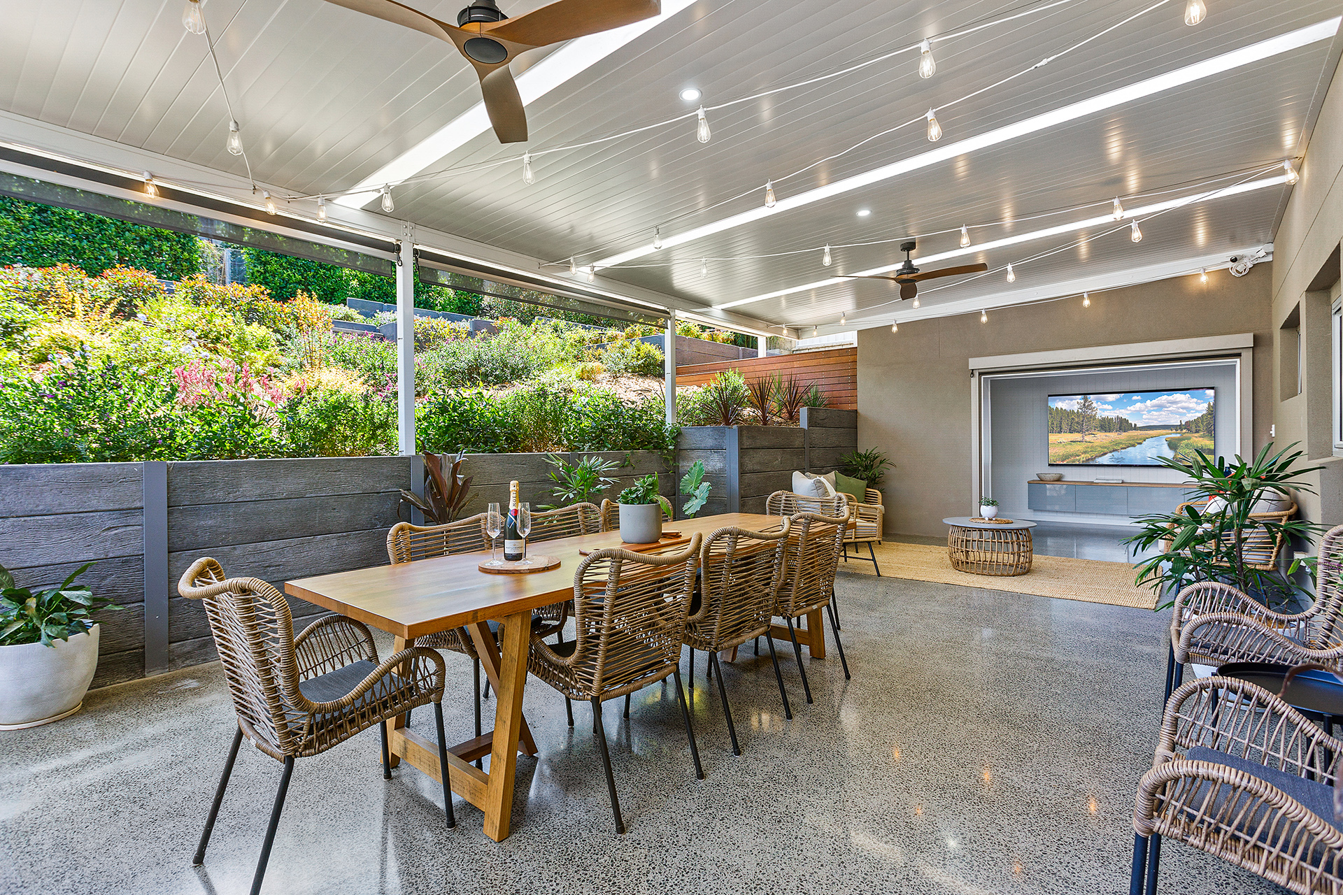 • Huge alfresco entertaining area with polished concrete, decorative lighting & ceiling fans
