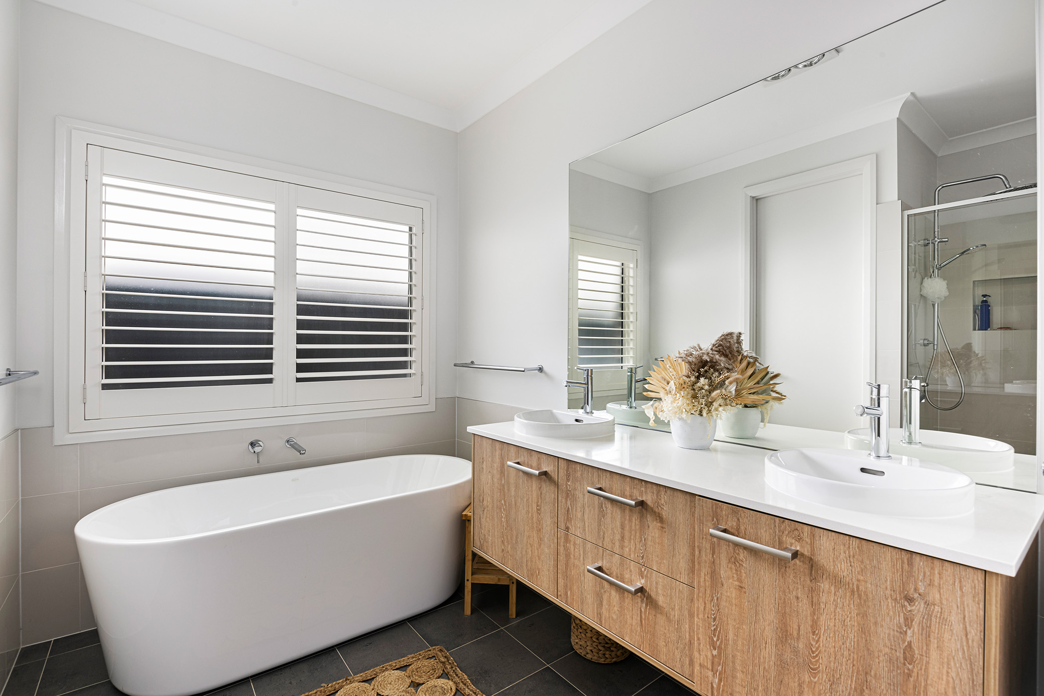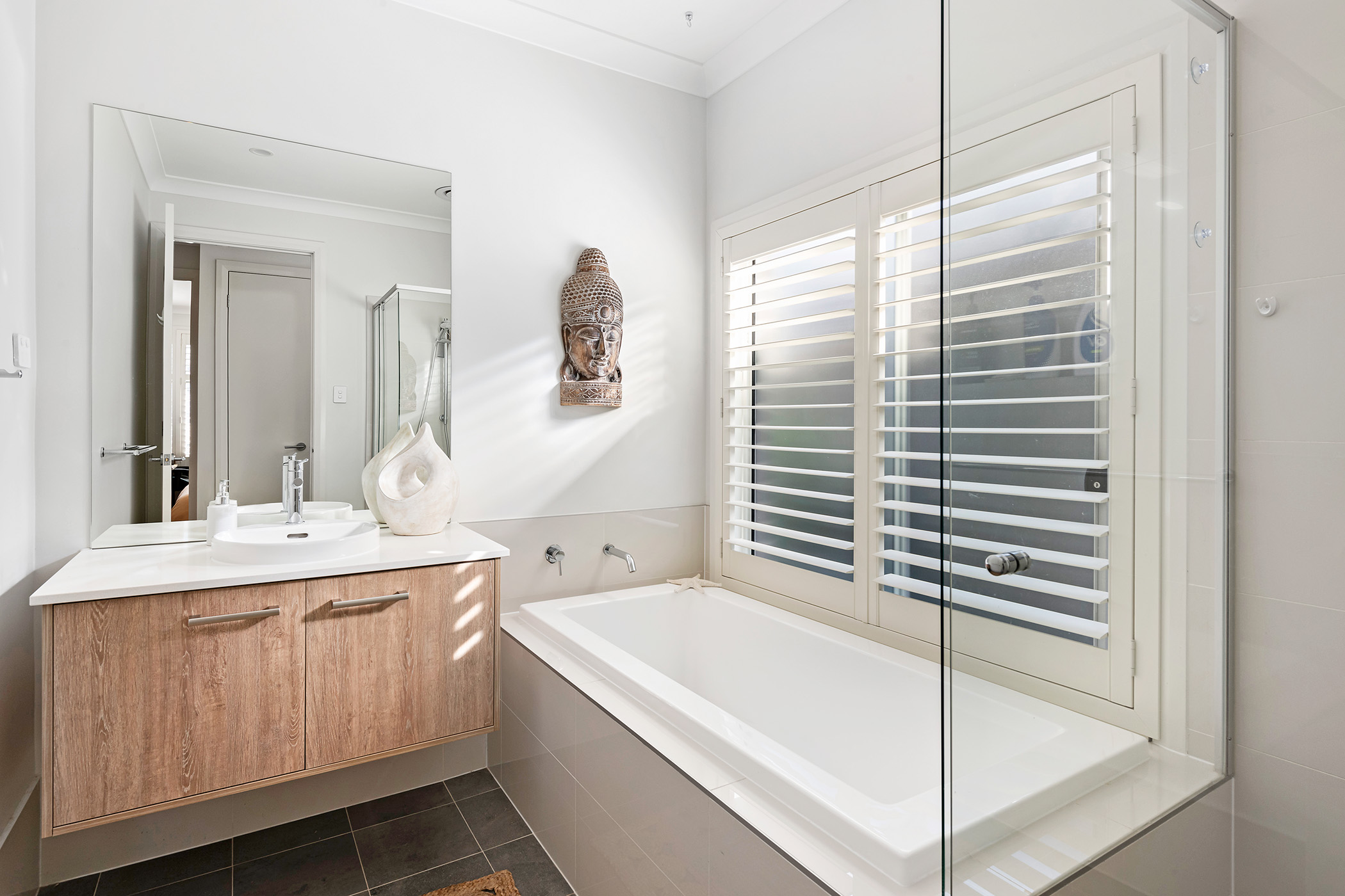 • Stylish contemporary bathrooms including bathtubs + separate powder room