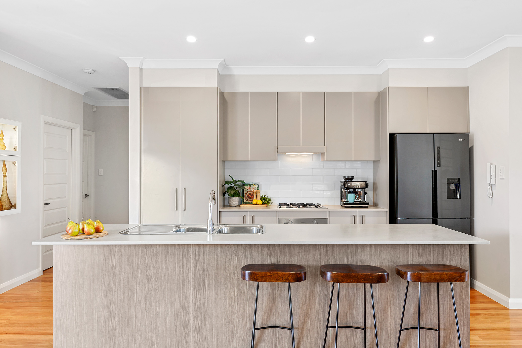 - Modern kitchen with Island bench including stainless steel appliances